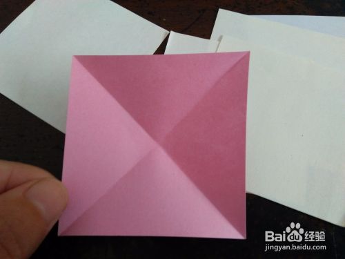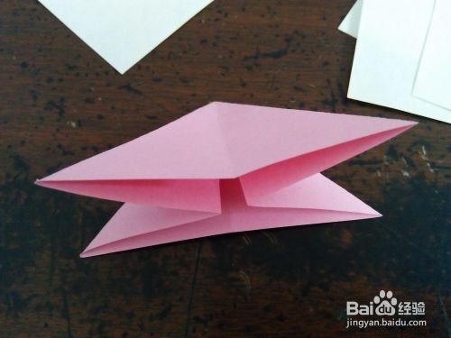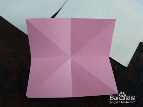 再把彩纸翻到背面,把两条中线对折一下。然后按照折痕折出图二的样子来。