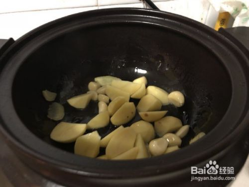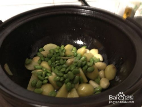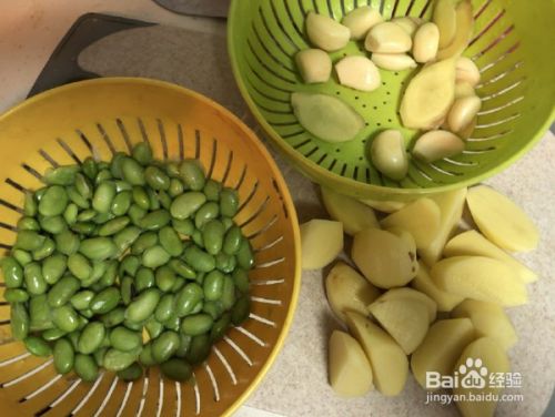 毛豆籽焯水,土豆去皮切滚刀块,葱姜蒜准备好