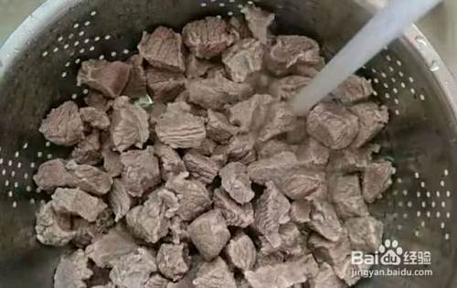 焯好水的牛肉,一定要用热水清洗一遍,把牛肉上面的泡沫清洗干净,这样就不会有腥味,吃起来也好吃,清洗干净后捞出来把水分沥干备用,焯水的时候一定不能煮太久,煮太久牛肉就会煮得太老不好吃。