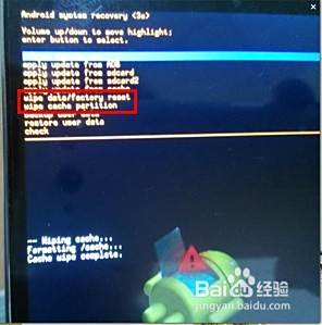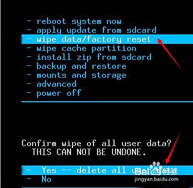 找到wipe data/factory reset(意思是:擦除数据,恢复出厂设),按音量键调到这一行再按屏幕下方中间按键来确定