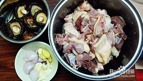 鸭肉砍成块。香菇用温水泡发,姜切片、蒜拍扁、小葱头切碎。