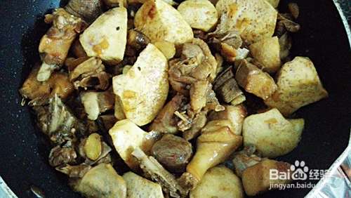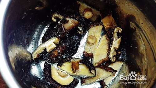 加入差不多末过肉的水和腌制好的香菇。加盖中小火焖半小时即可