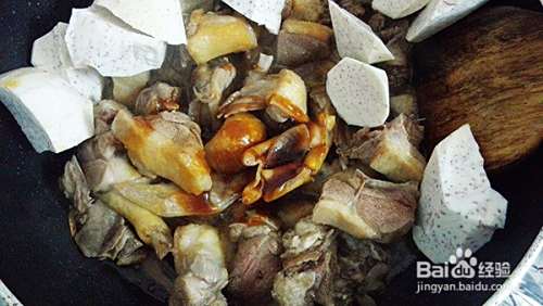 芋头去皮,切大块。加入芋头,蚝油生抽盐翻炒均匀。