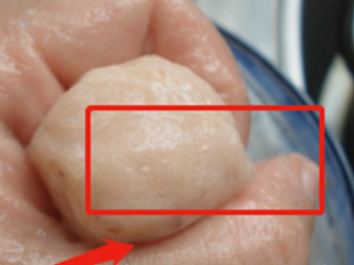 第三步,然后我们将搅拌好的虾泥放在手心里,再用勺子在户口里面卷起大小差不多的大小。