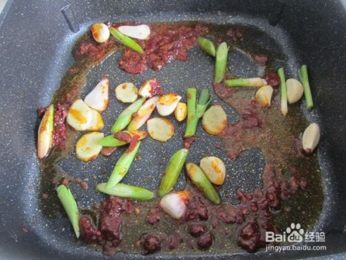 锅里加入花生油,把郫县豆瓣,大蒜,青蒜,葱,姜一起放入炒出香味