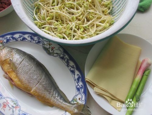 黄花鱼洗净,表面划花刀,黄豆芽焯水,豆腐皮,青蒜备用