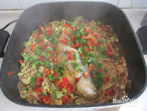 加入少许水,把煎好的黄花鱼放入,中小火大约10分钟,加盐调味,撒上青红椒丁,葱末,盖上盖子稍微熟一会,大约3分钟即可关火