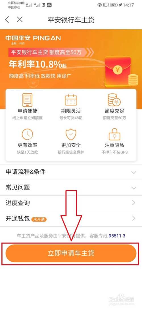 进入平安银行车主贷操作页面,点击【立即申请车主贷】选项,如下图所示。