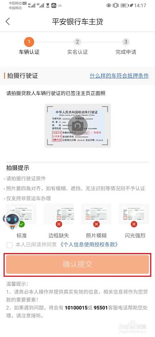 进入平安银行车主贷申请操作页面,根据申请流程完成包括【车辆认证】、【实名认证】后,点击【确认提交】,即可。如下图所示。
