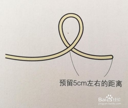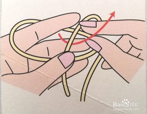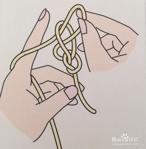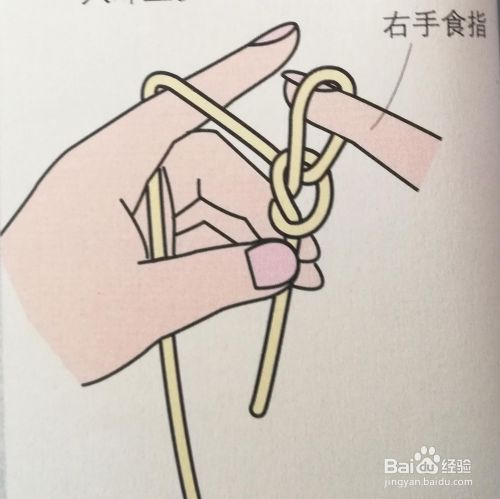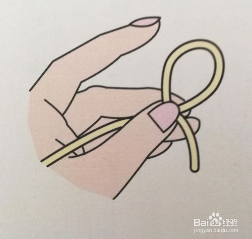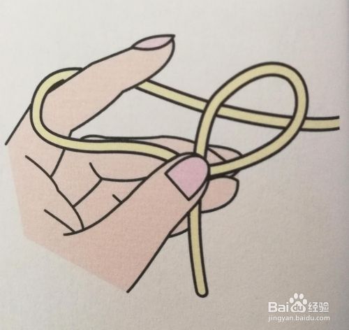 将编织绳挂在左手食指上,用左手的大拇指和中指按住步骤5中拉紧的结点,右手食指伸入环里。