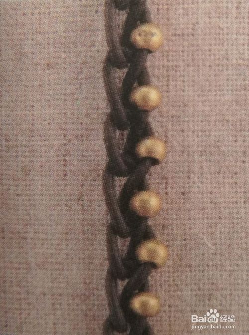 成品展示,在编织过程中,预先将几个串珠穿到编织绳里,每做一个环就挑一个串珠穿过圆环编织。