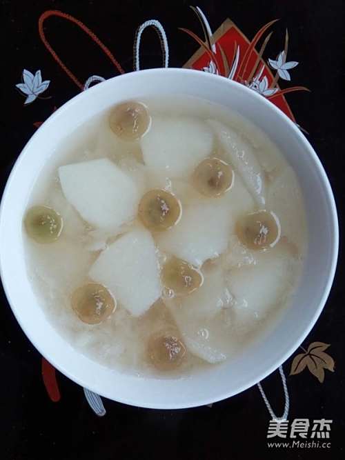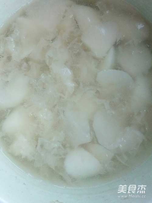 银耳炖至五成时,加入山药和梨继续炖至山药绵软,银耳拉丝既好。