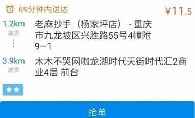 通过之后就可以接单了,每个订单都会显示公里数,上面的是你当前所在位置与商家之间的距离,下面的是商家与客户之间的距离,所以接单的时候一定要好好衡量,以免超时。