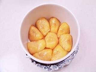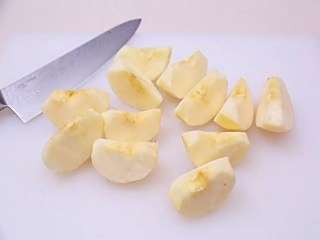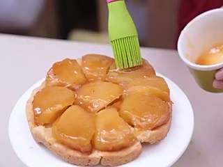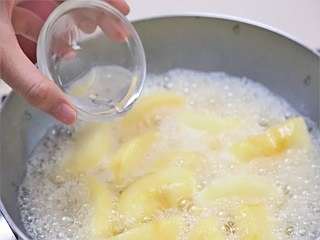 砂糖、20g椰子油和苹果放入锅内,小火,熬至苹果呈透明状。
