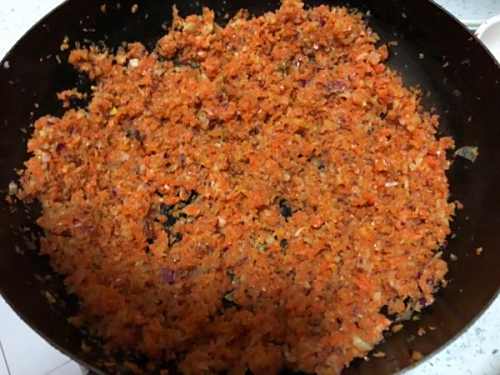 5洋葱搅成末儿,挤干水分,扔锅里和胡萝卜拌匀,马上关火。这一步主要是为了去一下洋葱的辣气。
