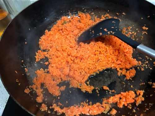 4油热后爆好葱花,下胡萝卜末儿翻炒。据砖家介绍,胡萝卜要与油充分接触才能释放出胡萝卜素。好吧,我们来炒炒炒……翻炒几下,与油混匀即可。