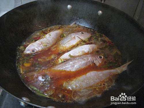 汤烧开后将红鱼及腌料一起倒入,加锅盖煮5分钟。中途用铁铲推动下。