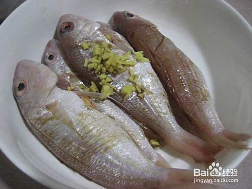 红鱼去磷、去肚内物、去鳃,打理清洗干净,放入大碗中,加一小勺醋,姜米、花椒、盐少许拌均,腌一小时。