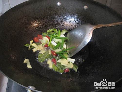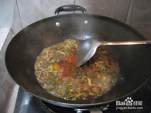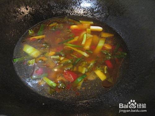 铁锅内加油,开中火,加入泡姜、泡椒、泡菜,一起放入锅内炒香。加400毫升水,加郫县豆瓣酱、酱油、白糖、盐煮开。