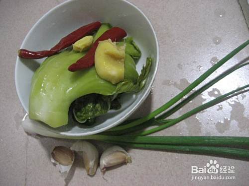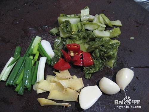准备食材:红鱼、姜、葱、蒜。泡姜、泡椒、泡菜。