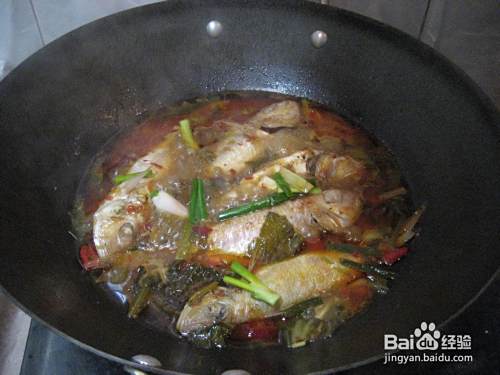 5分钟后开盖,红鱼就煮熟了,撒入葱段,关火。放少许鸡精,用铁铲推匀,全部倒入碗中。一道营养丰富,美味的酸汤红鱼就可以享用了。