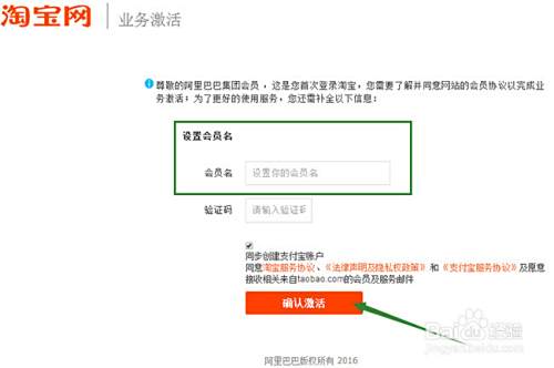 用支付宝账号登陆后,是下面如图的页面,就是设置自己淘宝账号名称。友情提醒下哦,这个会员名称一旦设置好之后,以后就不能更改了哦,想好什么名称再写哦。