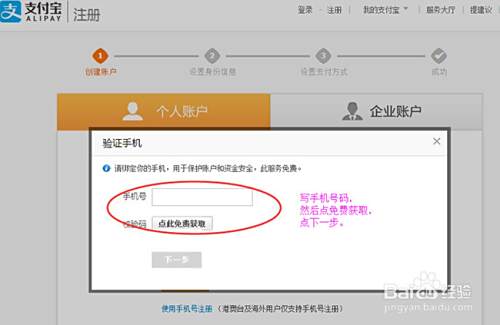 然后是手机号码输入,点免费获取验证码,点下一步。