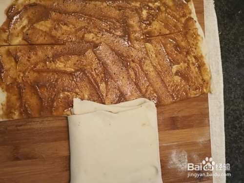 第四步,面团发酵好后,放在案板上,擀成大薄片,将调好的麻酱均匀的抹在上面,上下切几刀。