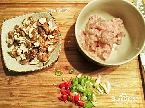 肉丝切碎,用盐、姜、料酒、玉米粉和橄榄油腌制5分钟。大蒜、青椒、小米和胡椒切丁,核桃去皮待用。