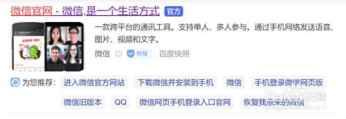 首先用百度百度下“微信官网”,然后选择官方认证点击进入。