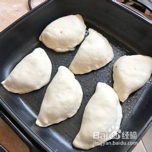 将擀好的面皮放上馅儿,两面合起来捏紧。