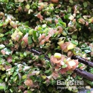 韭菜洗干净切碎肉馅虾皮盐少于花生油搅拌均匀,然后尝一下咸淡。
