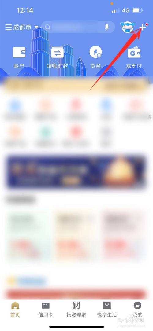 在手机上打开中国建设银行进入主页面后,点击右上方【+】图标。