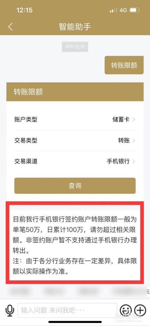 在智能助手这里输入“转账限额”发送,在收到的回复中选择账户类型、交易类型和交易渠道后,点击【查询】。