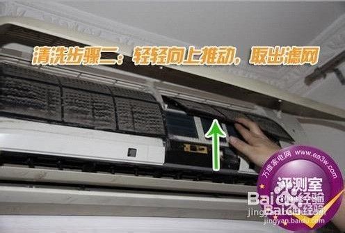 首先,我们要打开空调面板。在空调左右两侧,有可以开启面板的扣手,用户只需找到轻轻往上推动,便可开启打开空调的面板,看见其内置的滤网。