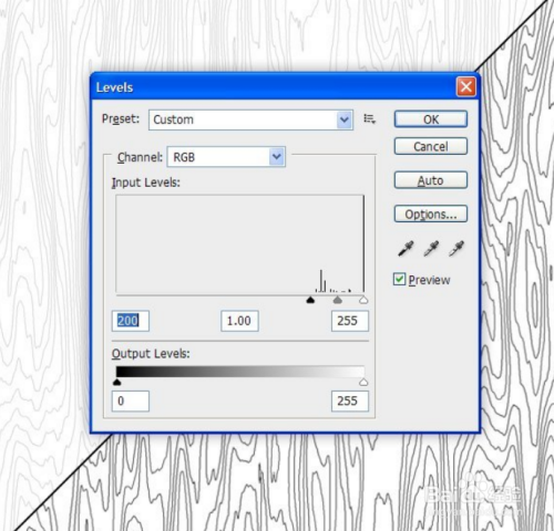 将色阶调整下,参数设置如下图所示。调整色阶的目的是为了让木纹理更好的显示出来。