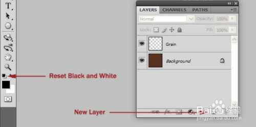 创建一个新的图层并命名为“Grain”,然后将前/背景色变为黑白,在英文输入法下按住”D”,就可以恢复哦。