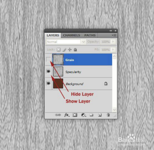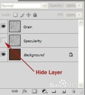 将“Grain”图层复制一层,并重命名为”Specularity(中文意思:高光,这将成为我们的高光图)”,然后放在在“Grain”图层下方,层位置如下所示,并隐藏它。