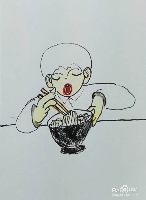 用线条和曲线画出一个碗,和里面的面条,然后画出拿筷子的两个手。