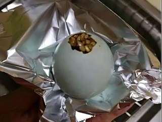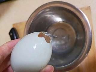 咸鸭蛋剥开小孔,倒出蛋清。