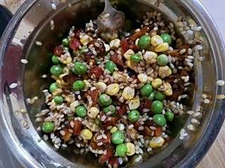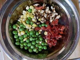 香菇、腊肠、玉米和青豆一起放入盆中。