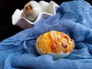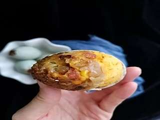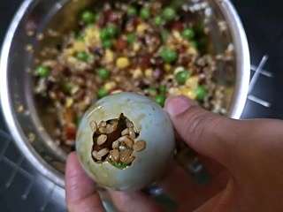 香菇、腊肠、玉米和青豆一起放入盆中,倒入糯米和调料,搅拌均匀,咸鸭蛋剥开小孔,倒出蛋清,灌入馅料,放入蒸锅内蒸熟。