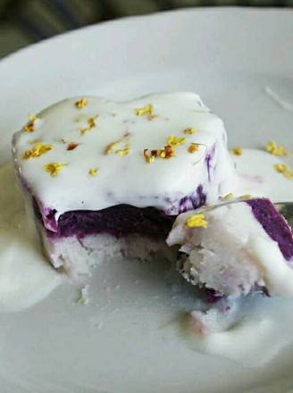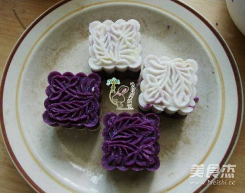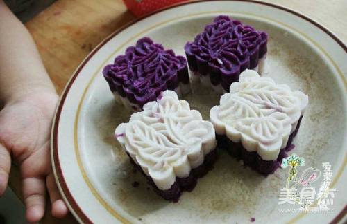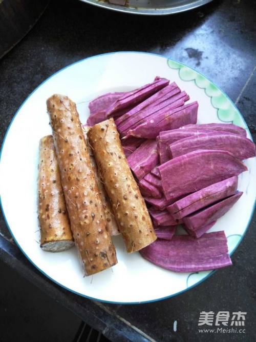 1紫薯洗净削皮切片,铁棍山药洗净切段,上锅蒸熟。怕削山药皮手痒的话,就连皮蒸,蒸熟再刮掉皮。