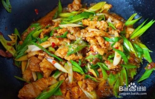 蒜苗下锅,加入半勺白糖,一勺料酒,一勺生抽,适量盐。炒匀关火。