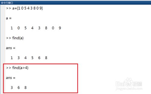 第四步输入find(a>4),可以找出a数组大于4的元素下标,如下图所示: