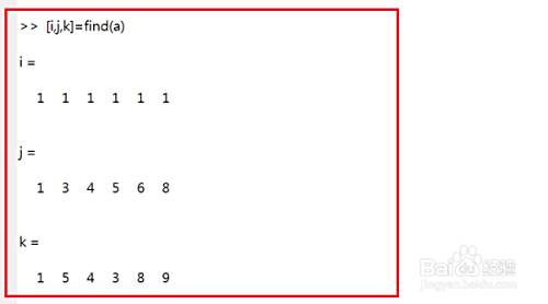 第五步输入[i,j,k]=find(a),可以找出a矩阵非0元素的下标位置和值,根据需要使用find函数,主要是根据条件找元素下标或者找非0元素,如下图所示: