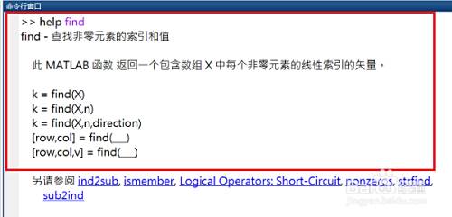 第一步我们首先需要知道matlab中find函数可以找出非0元素的下标和值,也可以找出满足条件的下标和值,命令行窗口输入help find,可以看到函数用法,如下图所示: