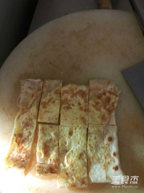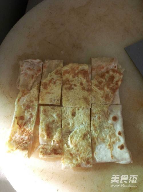 将鸡蛋打散,平底锅放入油,把面皮放入锅中,烙至一面金黄。拿出把鸡蛋放入锅中,面片铺在上面,烙金黄即可