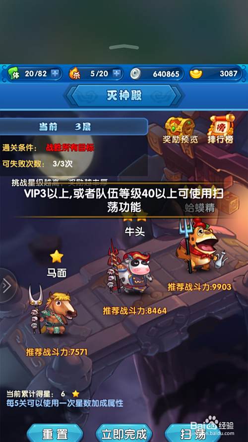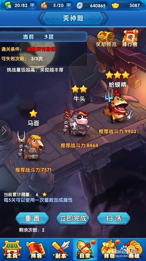 灭神殿每日可以重置两次,重置之后回到第一层,每层都有指定的通关条件,同时会分为三个难度星级,推荐战力越高难度越大。