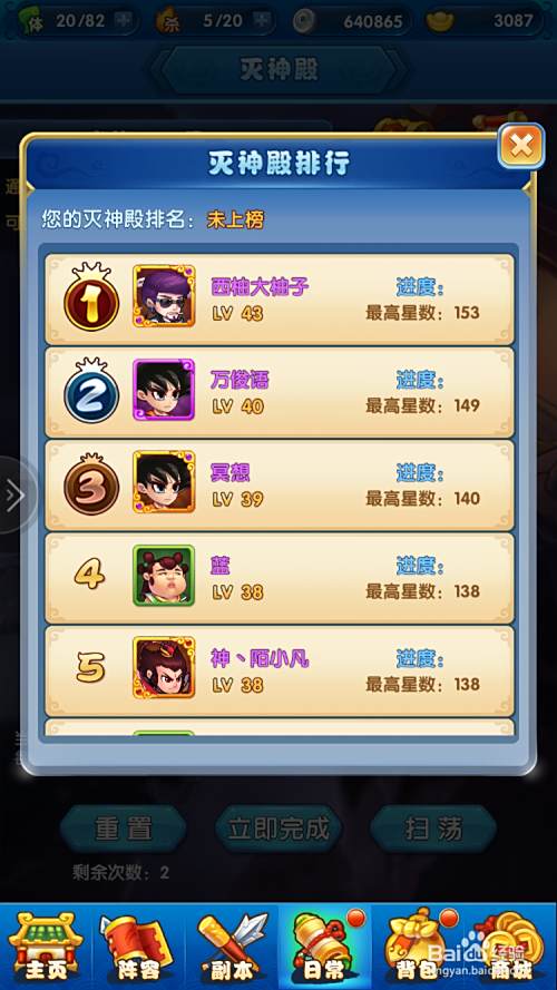 灭神殿也有排名,根据挑战获得的星数来进行排名,关卡难度越大获得星数也越多,在排名中可以查看自己是否上榜。